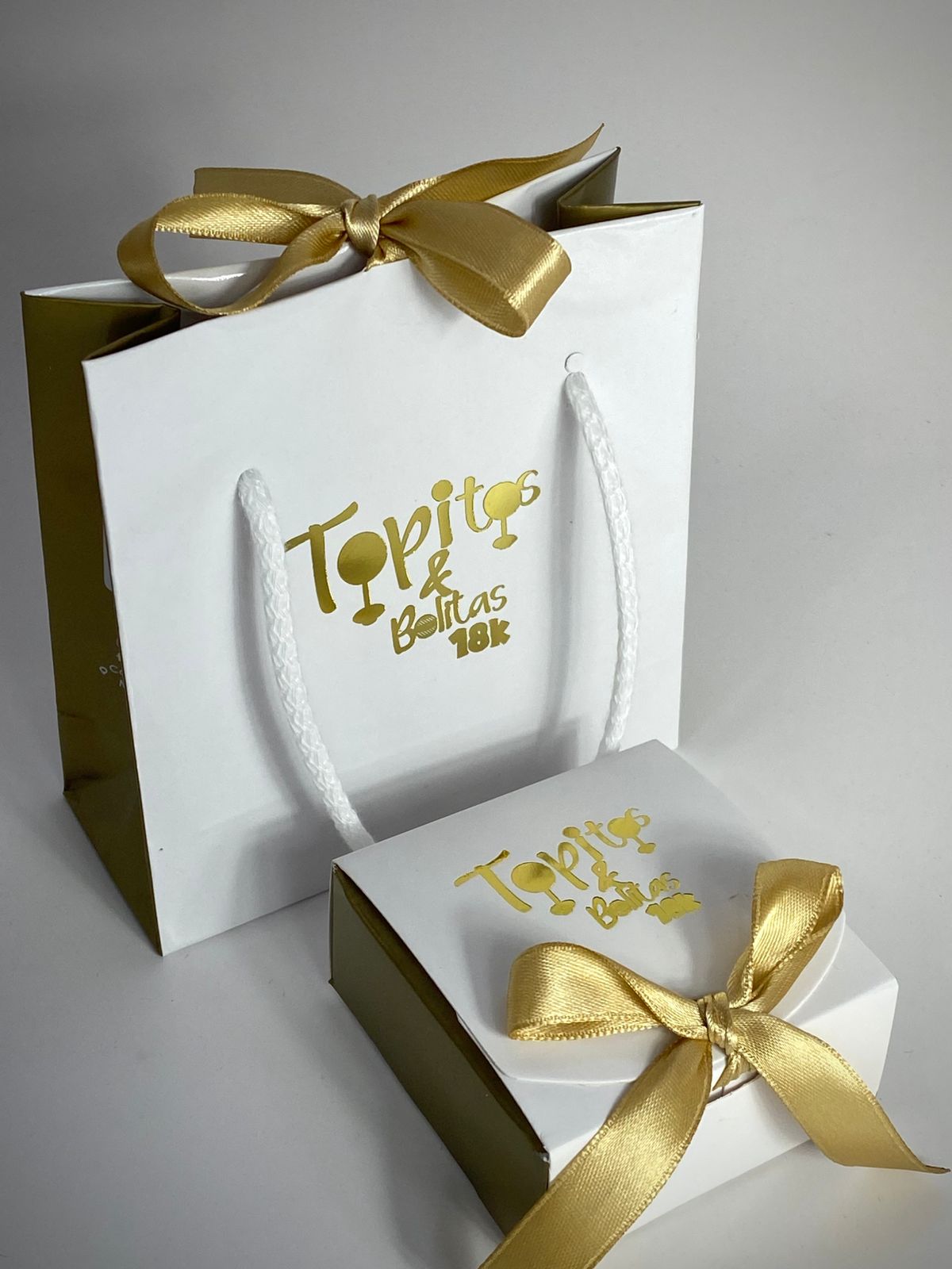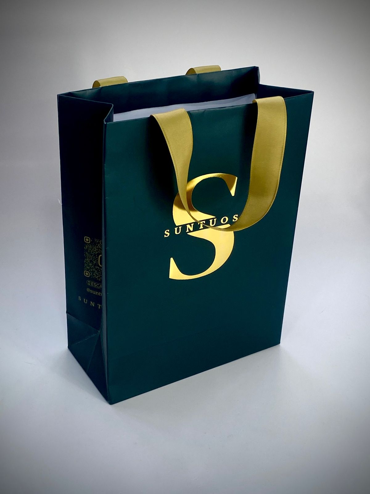Bolsa y caja de lujo, impresas a una tinta o varias, acabado mate o brillante, estampadas al calor (foil dorado) papel propalcote 200g,